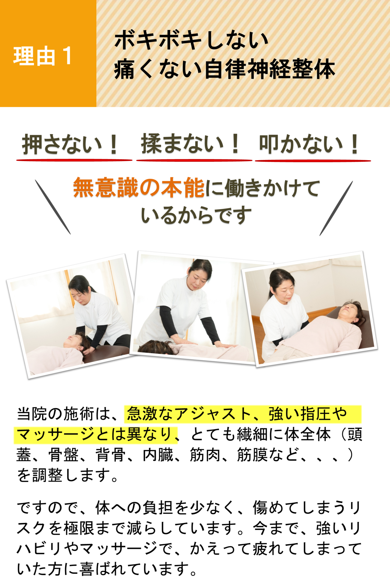 おすすめしたい人:手術を勧められている方、手術に前に一度試して損はない。痛い整体が苦手な方にもおすすめ。